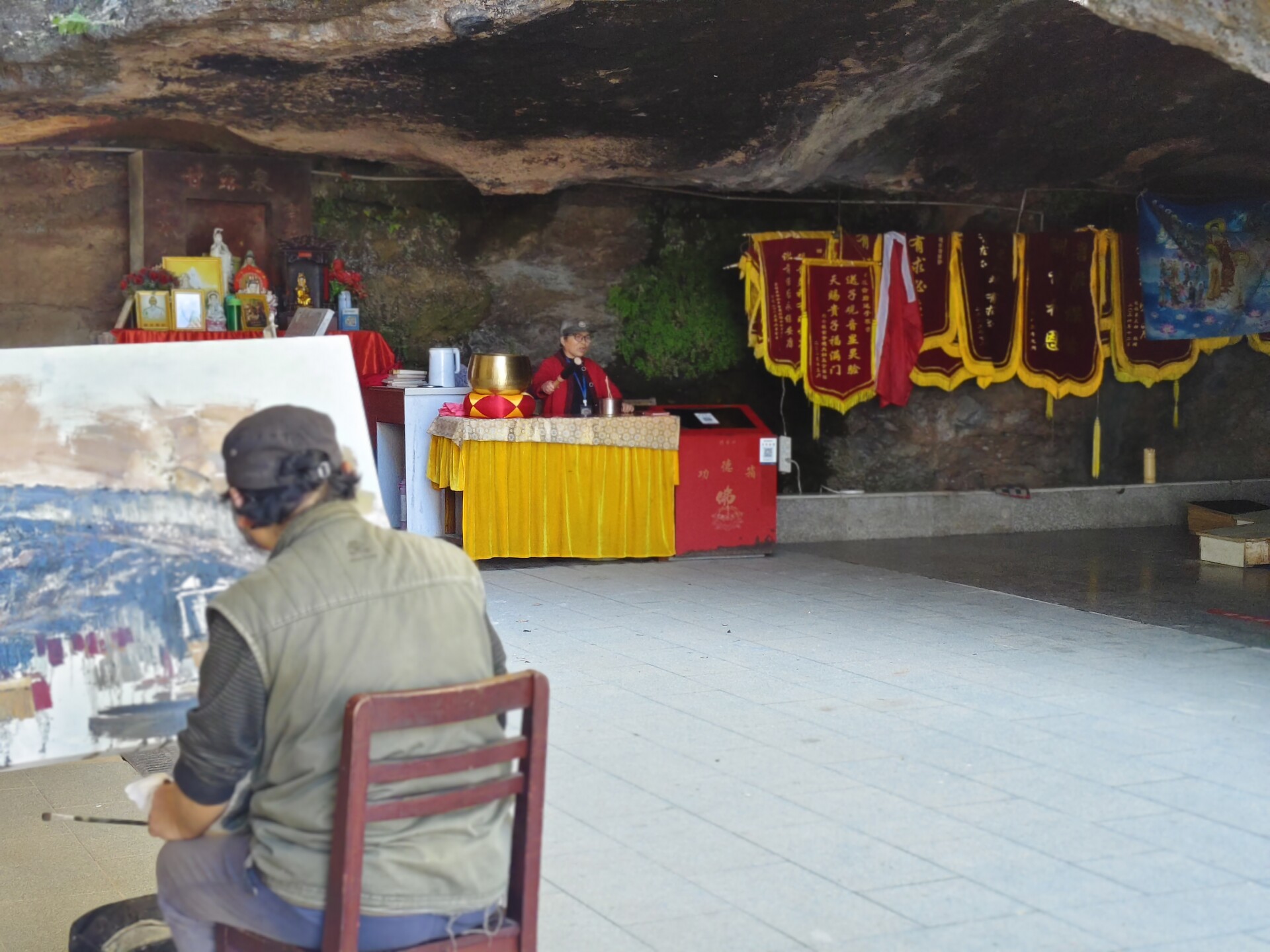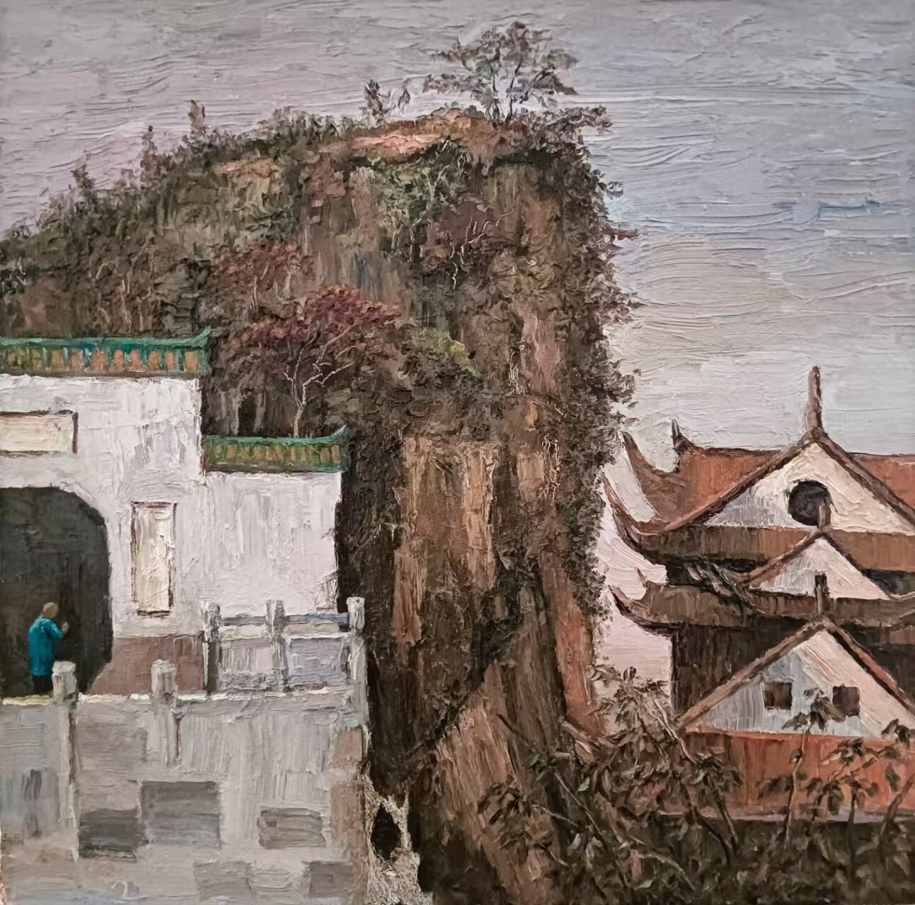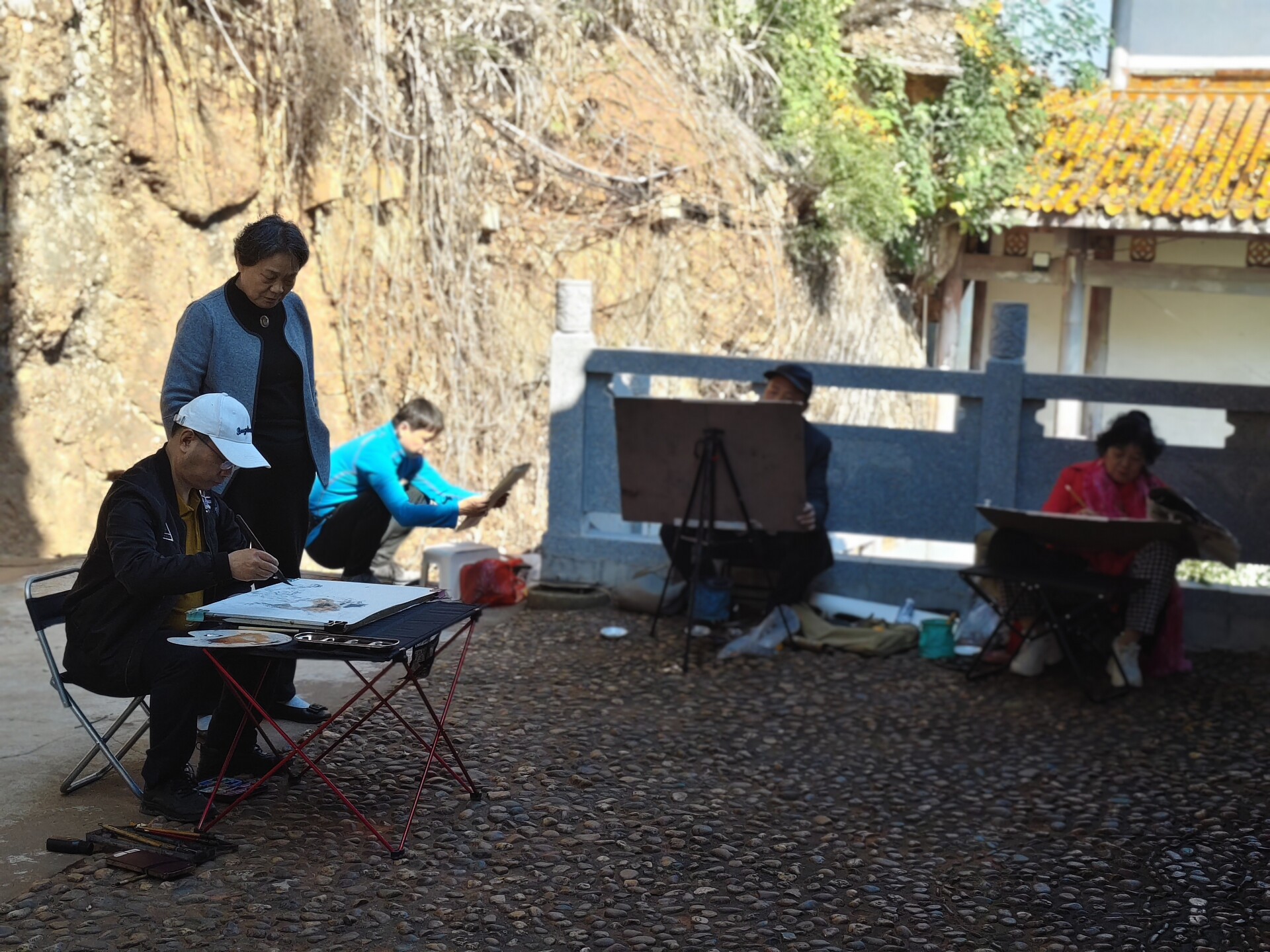 坐落于天元区雷打石镇湘江西岸的空灵岸古寺,承载着1500余年的历史积淀,飞檐翘角间沉淀着岁月的厚重。初冬的古寺褪去了喧嚣,更添几分宁静与庄重,门前古树枝桠遒劲,叶片染上深浅不一的赭黄与橙红;殿宇墙体在暖阳下泛着温润的米白,与青灰色瓦顶相映成趣。艺术家们或伫立山门远眺江景,或静坐殿宇旁细观光影,手中画笔在画布上灵动游走——细腻的笔触勾勒出古建的斗拱飞檐,浓淡相宜的色彩晕染出苍劲树木的层次感,将秋末初冬的清寒气息与古寺的静谧氛围完美融合。