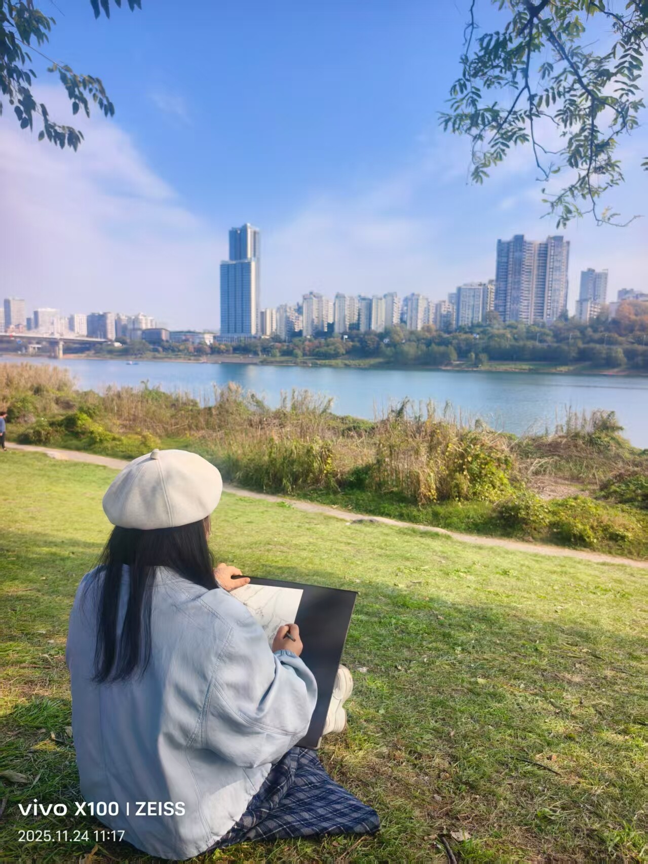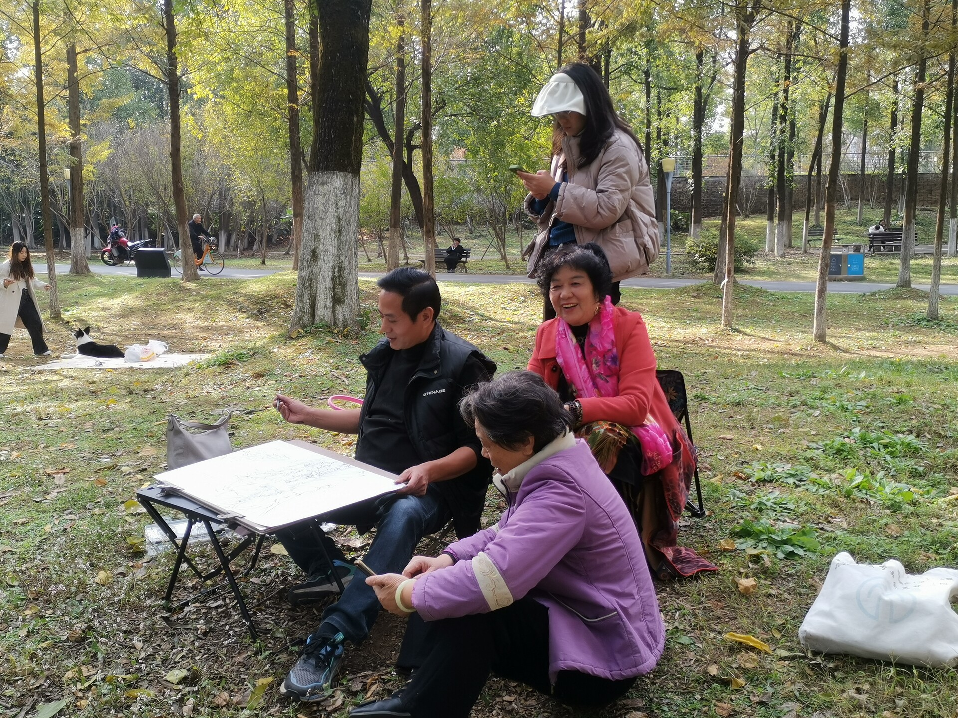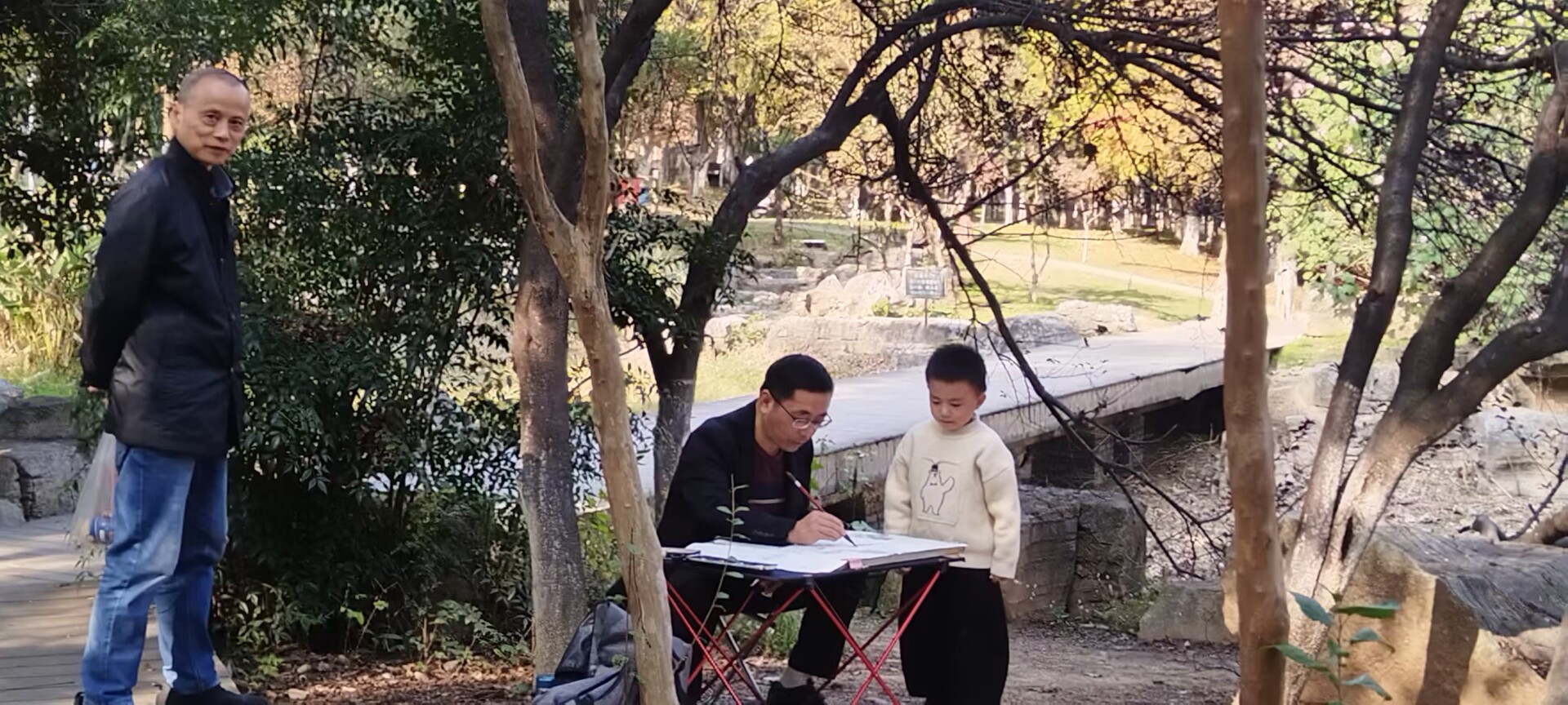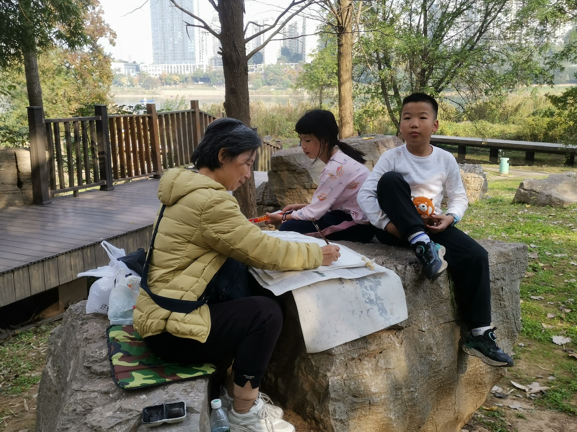 时隔一周,写生队伍转场至株洲沿江风光带,感受城市与自然共生的活力之美。初冬的沿江岸线宛如一幅流动的画卷:澄澈的江水在暖阳映照下泛起粼粼波光,微风拂过,层层涟漪向远方扩散;岸边垂柳虽已褪去浓绿,细长的枝条仍随风轻摆,与湛蓝的天空、洁白的云朵构成清新淡雅的画面。艺术家们纷纷寻得佳处,或在江边石凳上支起画架,或在小径旁的草地上铺开画布,以轻快的笔触捕捉晨光中的江雾、随风摇曳的柳枝与远处的山水轮廓,将初冬清晨的宁静与灵动定格在方寸画布之上。写生过程中,不少市民驻足围观,对画家们笔下的城市美景赞不绝口,部分艺术家还与市民交流创作心得,让艺术走出画室、贴近生活。