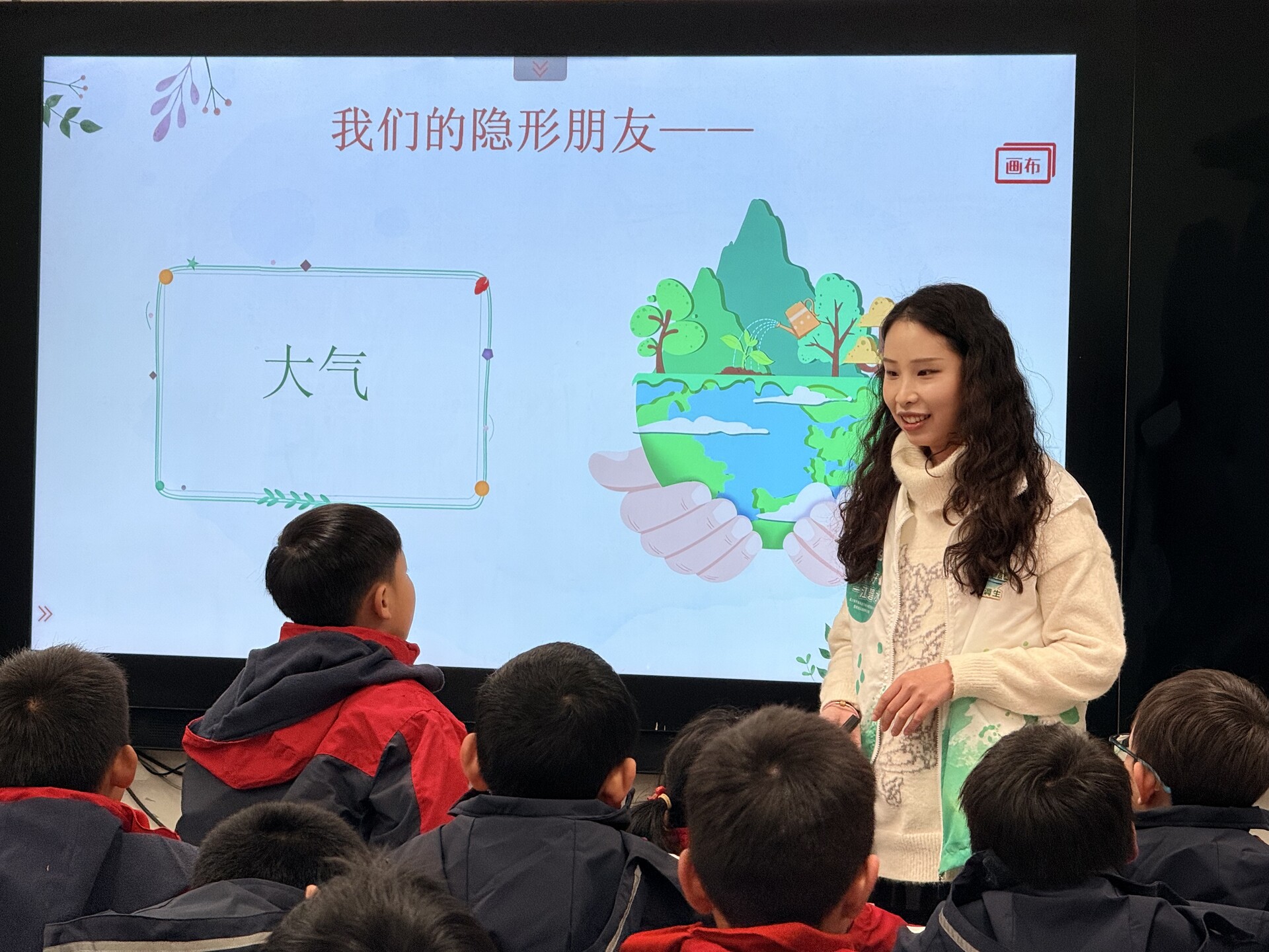 “看不见摸不着,不吃饭不睡觉,人人离它活不了,蓝天底下处处跑。”活动从一则生动的谜语开始,课堂气氛瞬间活跃起来。孩子们在轻松互动中认识了大气这位“看不见的朋友”。宣讲队员从大气的供氧、防晒、调温三大功能讲起,结合校门口的车流、生活中的雾霾天等常见现象,引导孩子们关注身边的污染问题。随后,又和大家一起探讨绿色出行、节约能源、爱护植物、垃圾分类等环保小窍门,让守护蓝天的行动贴近日常。
