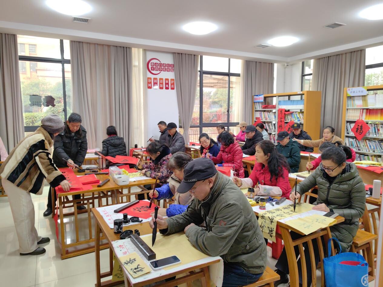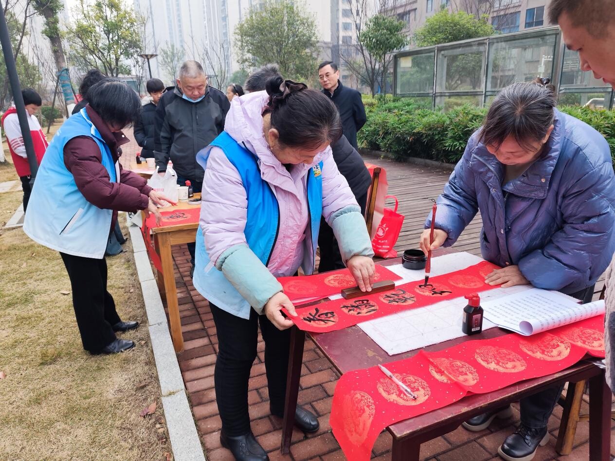 值得一提的是,参与此次活动的小区党支部书记与党员骨干们也是社区治理的积极力量。殷书记常年牵头协调小区各类事务,是社区治理的“连心桥”;书法班的成员们在社区巡逻、文明劝导、邻里调解中发挥了重要作用。他们此次“执笔“,既是以自身特长服务社区,更是以行动诠释着“党员带头、骨干先行”的模范作用。此次活动中,大家交流着过去一年练习书法心得以及参与志愿服务的体会,笑声与墨香交织,党群关系在共同创作的活动中愈发紧密。