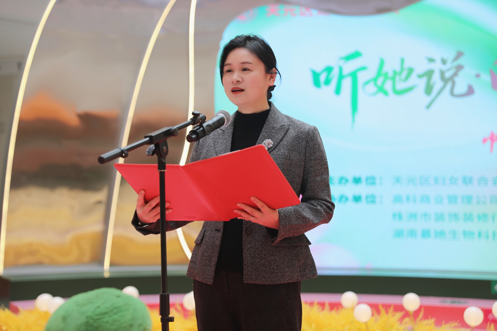 在最动人的“听她说”故事分享环节,来自不同领域的3位优秀女性代表刘娟、杨华、汪姝彤依次分享奋斗故事。企业代表的坚韧智慧、基层妇联主席的热爱专注、创业女性的柔情魅力,让现场观众深受感染。她们以朴素的语言讲述真实的经历,展现了新时代天元女性在各自岗位上默默耕耘、闪闪发光的别样风采,成为现场女性同胞身边生动的榜样,现场观众无不为之动容,掌声一次次响起。